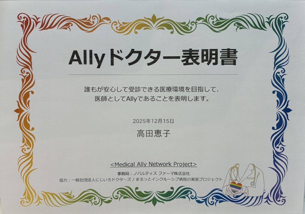 当院はノバルティス ファーマ株式会社が提供する「LGBTQ+と医療」に関する研修を受講し、Allyマップに登録しています。